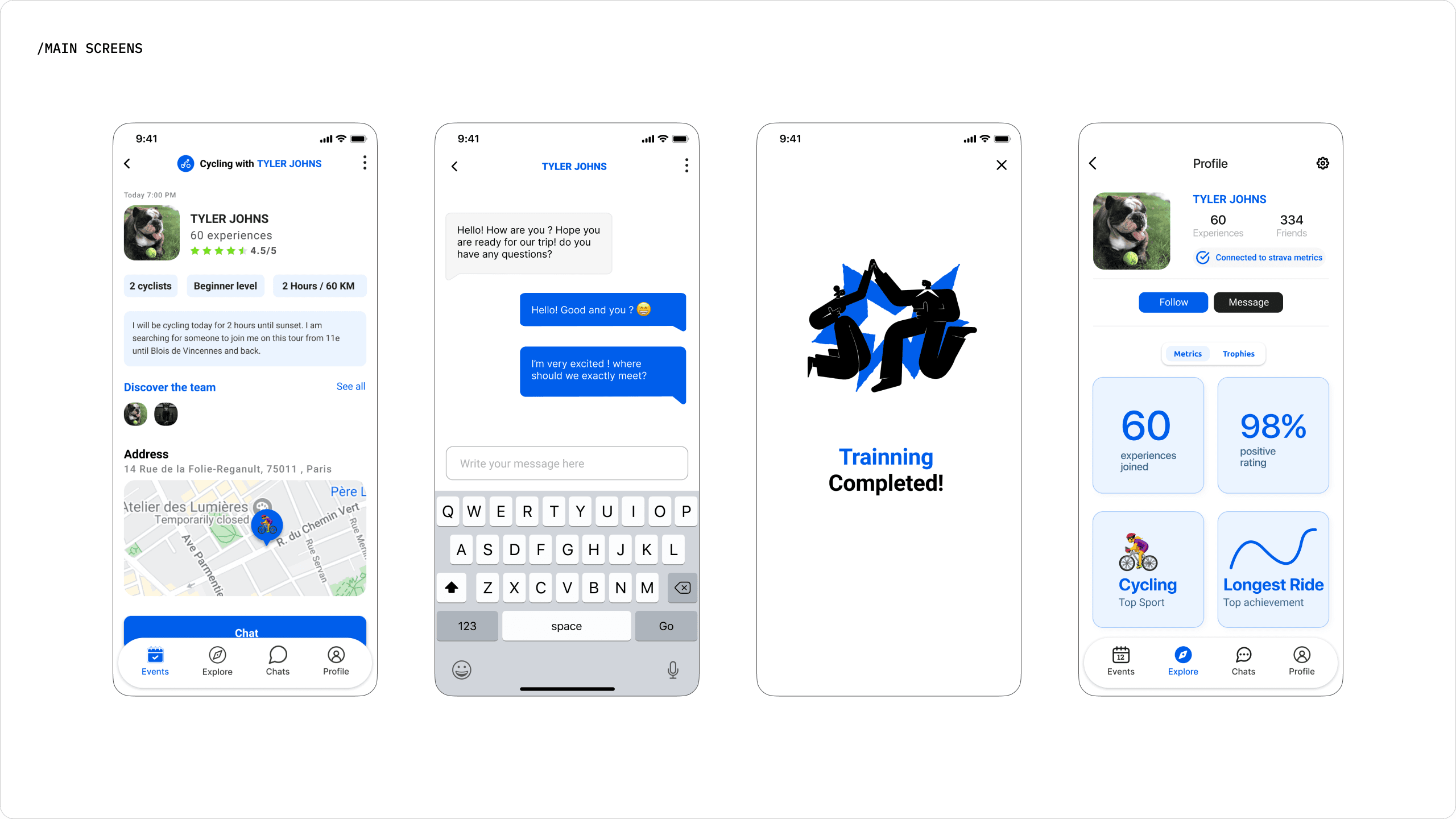 The resulting MVP positioned Catch as a dedicated platform for connecting workout partners and communities, built around three core pillars: safety, personalization, and quality of experience. Users could define their preferred activities, skill level, and group size, discover nearby workouts, and join or organize sessions with confidence. Safety was embedded through user verification, activity visibility, and feedback mechanisms, while discovery was optimized to surface relevant people and events quickly. The experience was intentionally designed to feel lightweight and inclusive, lowering the barrier to participation while encouraging real-world interaction rather than prolonged in-app engagement.