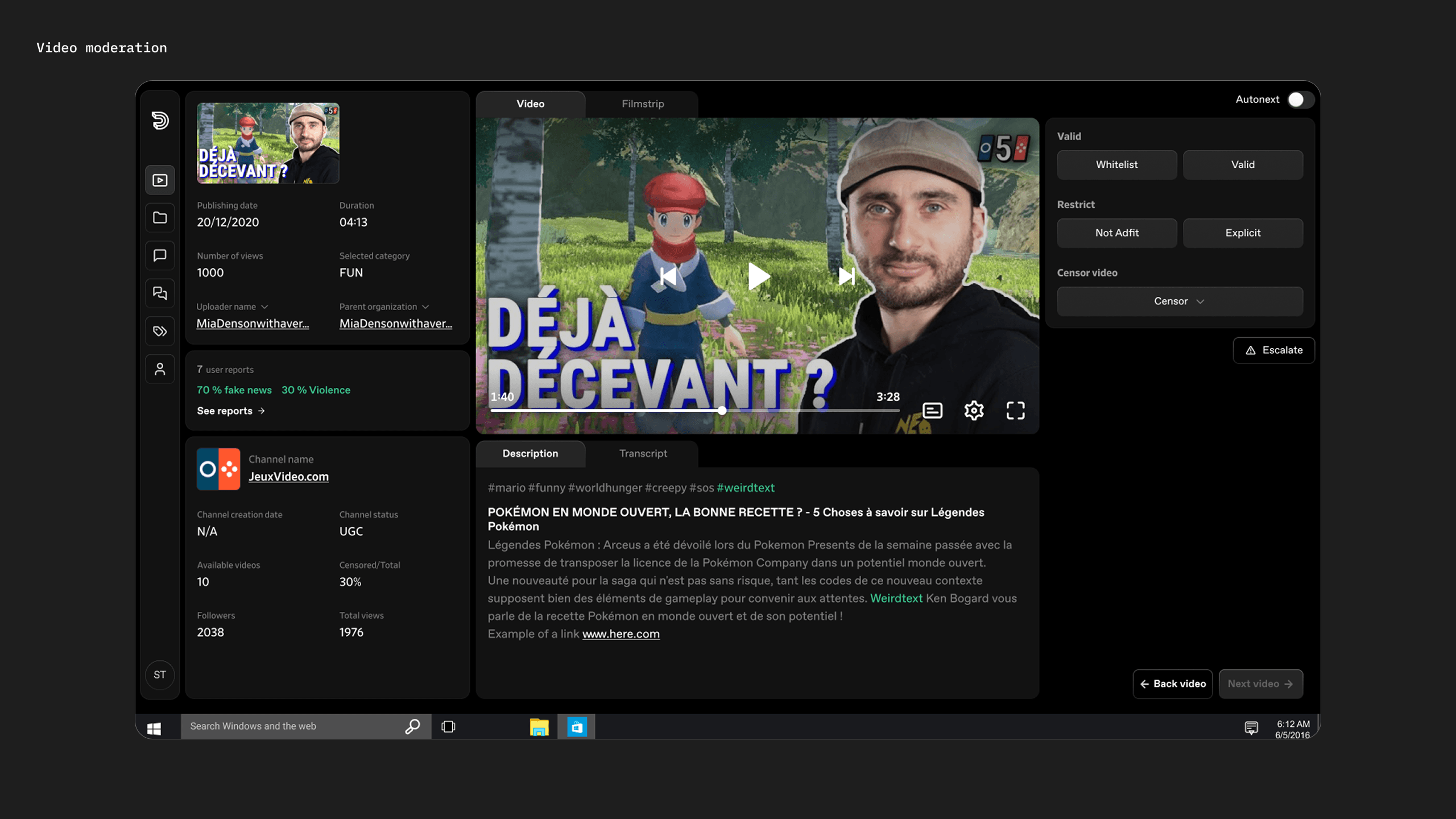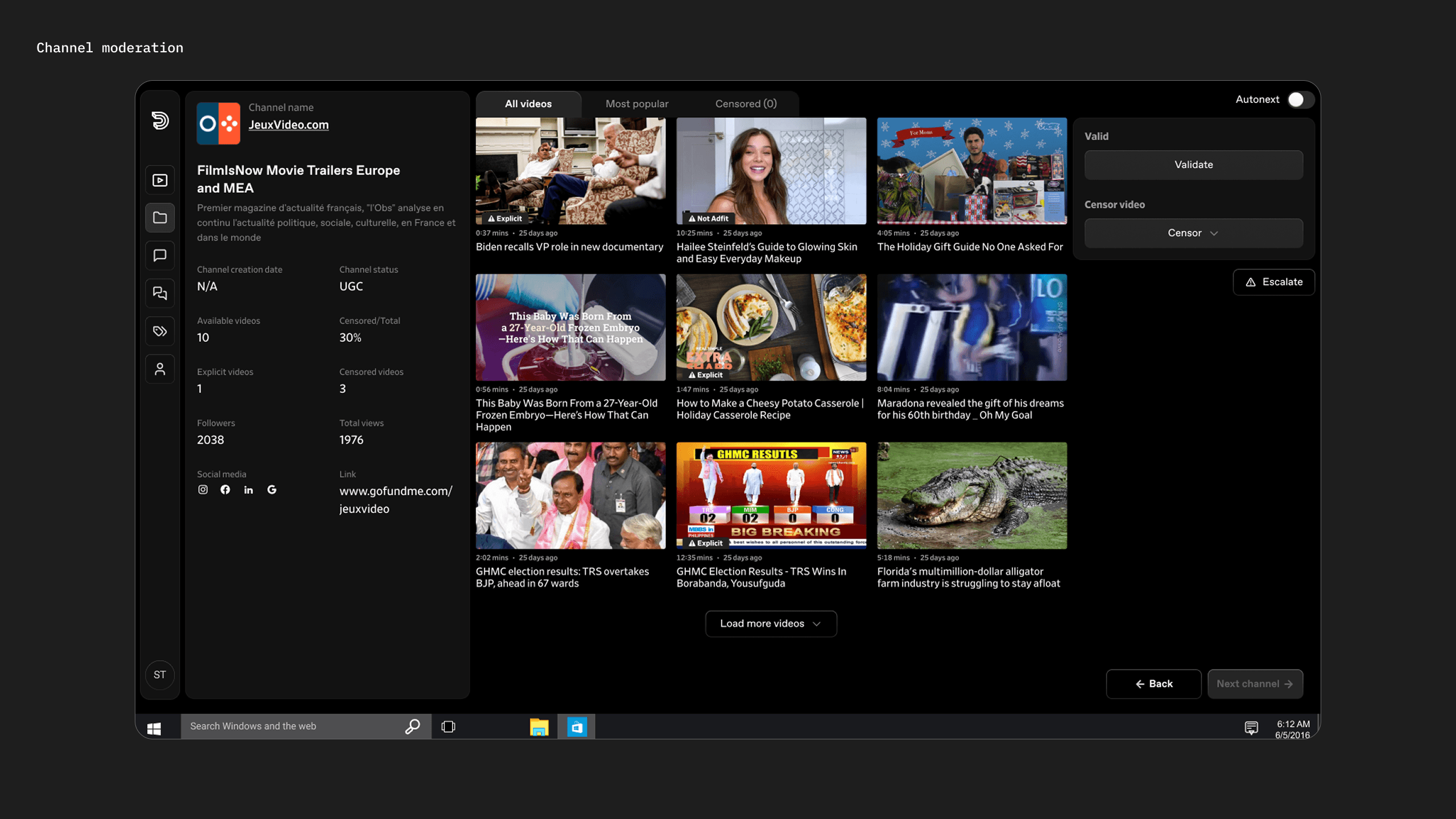 The main challenge was balancing two opposing forces: increasing moderation throughput while reducing the likelihood of errors. Moderators worked long hours, in dark environments, on large screens, and were expected to maintain focus across hundreds of decisions per session. The platform also needed to support multiple moderation types (videos and channels initially, with messages and comments planned later) without fragmenting the experience. On top of this, the solution had to be scalable, adaptable to changing screen sizes, and resilient to future product evolution, all while remaining fast, safe, and mentally sustainable for its users.