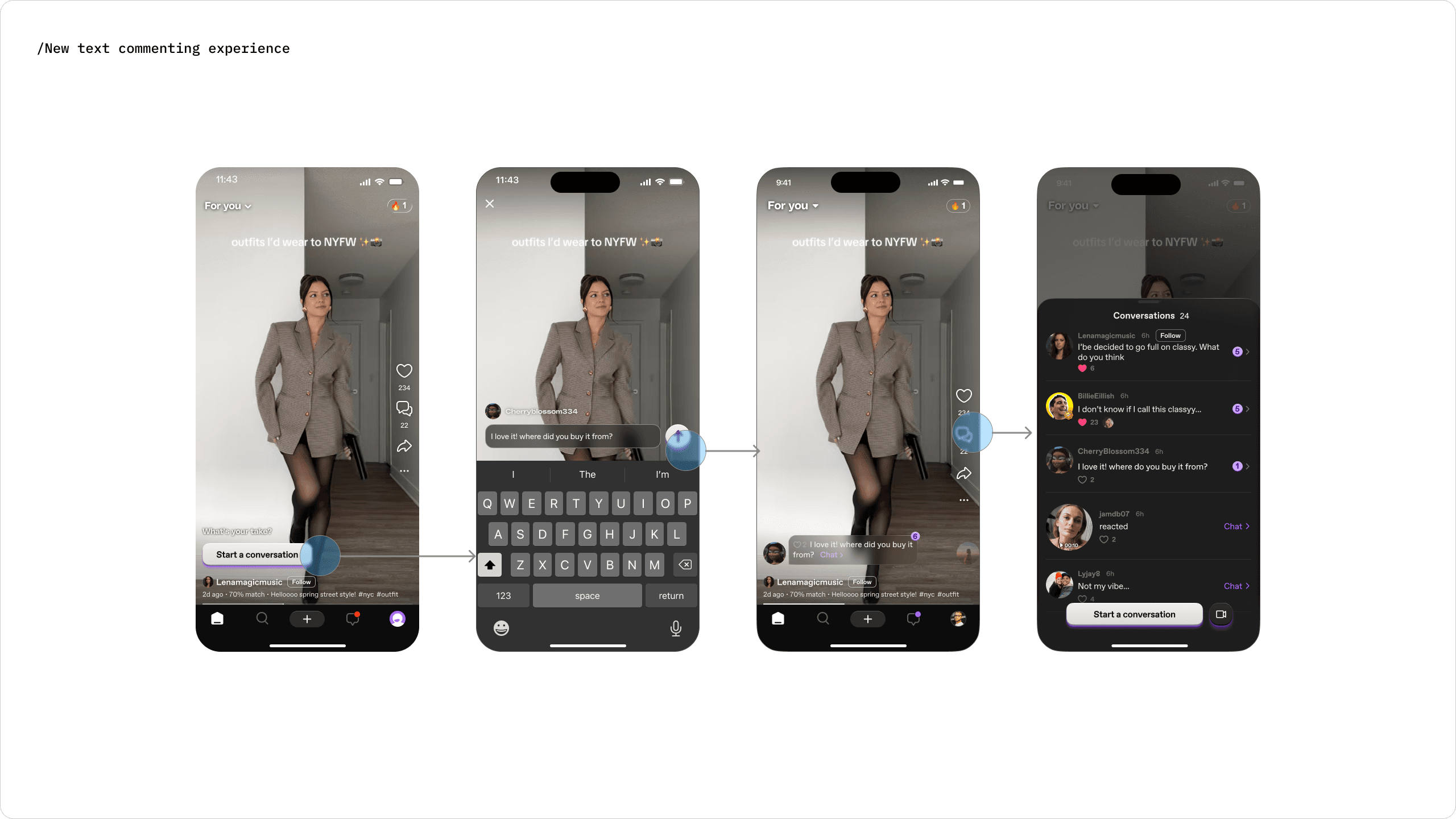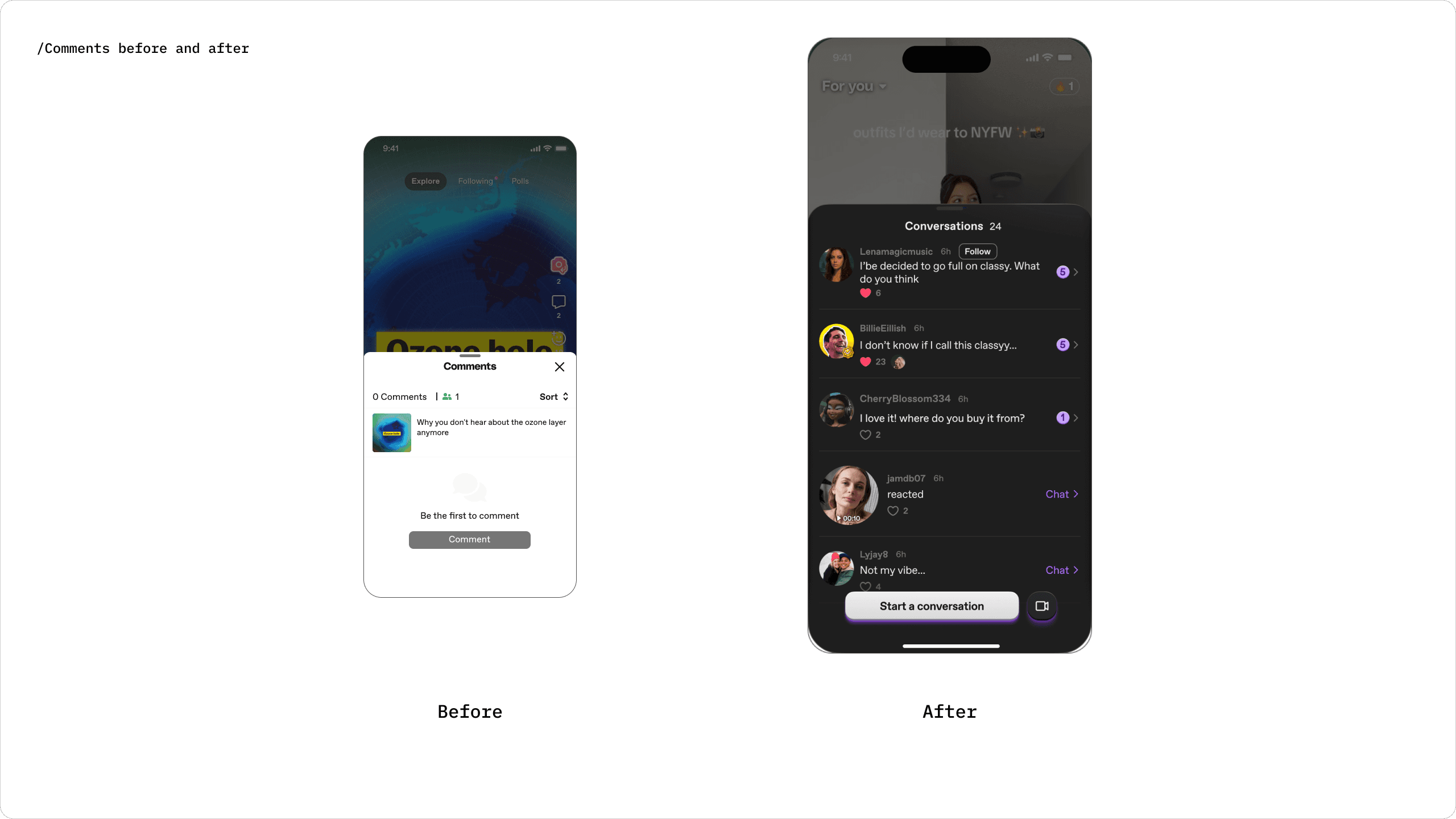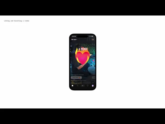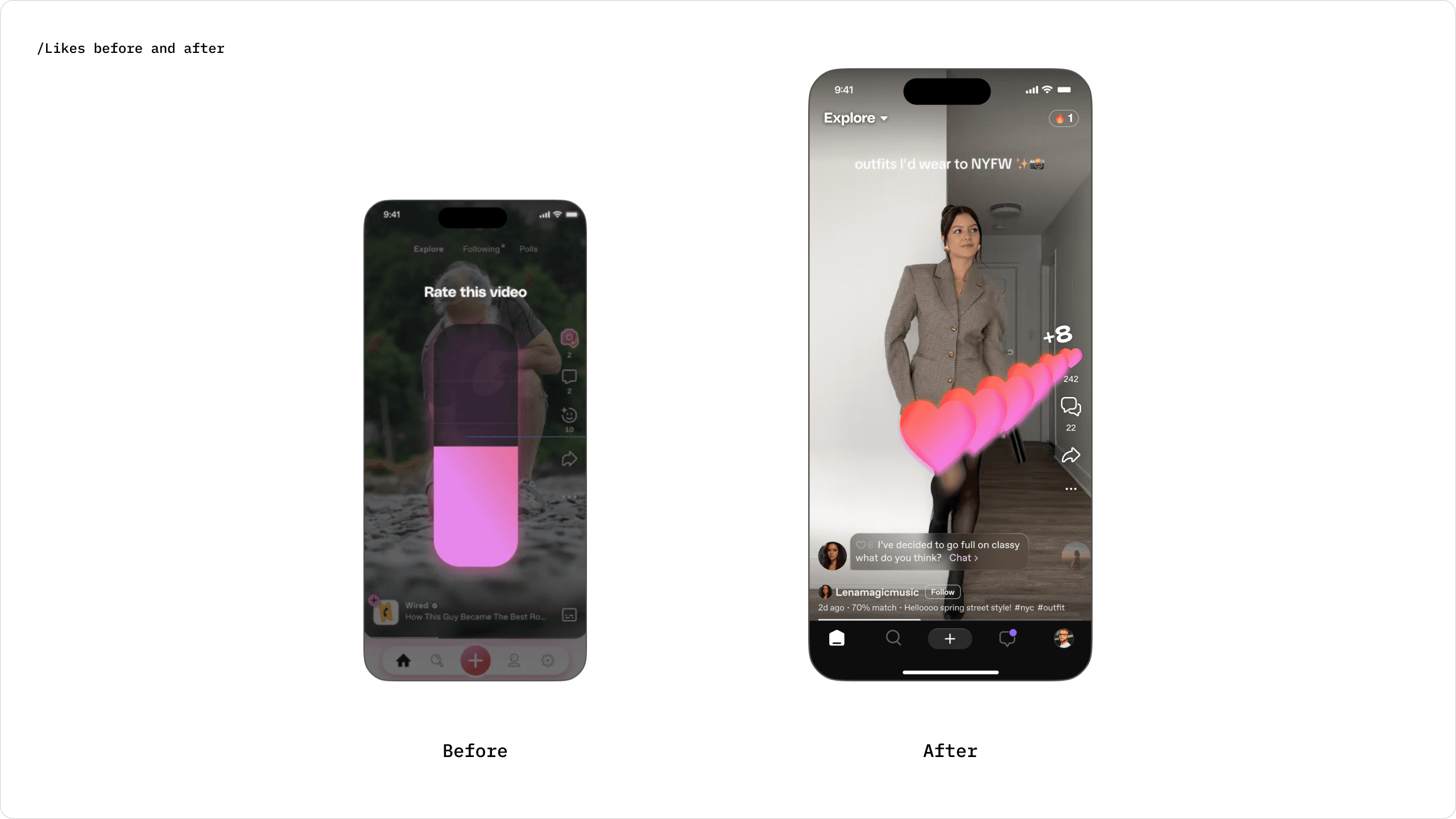 We started by addressing the foundation: the video format itself. Moving from a 16:9 feed to a vertical feed unlocked the possibility of modern, gesture-based social interactions. From there, we focused on the two most fundamental social actions: expressing appreciation and participating in conversations.