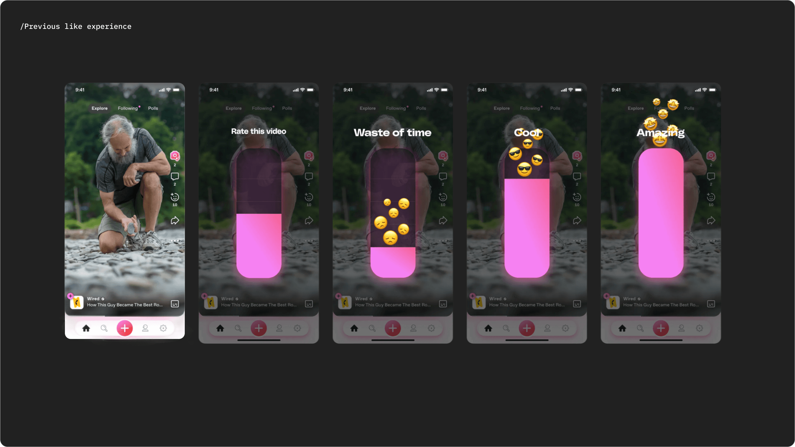 We initially hypothesized that a non-binary rating system would allow users to express nuance beyond a simple like, resulting in richer engagement and better recommendation signals. We introduced a slider-based interaction with five levels, supported by emojis, and explored different metaphors through prototyping and research. Early tests were encouraging: users understood the interaction, enjoyed the expressiveness, and likes per video start increased by 5%.